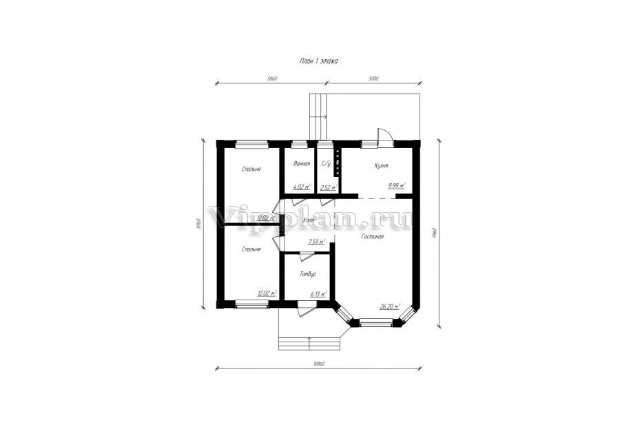 Проект индивидуального одноэтажного жилого дома с размерами 10,86 x 9,96 м.